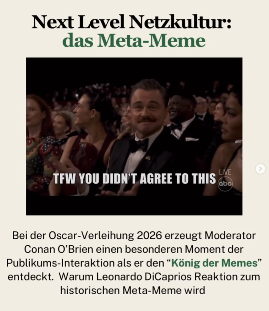 Nicht wenige dieser Szenen stammen aus Filmen mit Leonardo DiCaprio. Der Moderator der Oscar-Gala 2026, Conan O’Brien nennt DiCaprio deshalb sogar den „König der Memes“. Mit diesem Titel eröffnet er einen besonderen Meta-Meme-Moment: Er erschafft nämlich gemeinsam mit DiCaprio während der Oscar-Verleihung ein eigenes Meme. Die Kamera schwenkt auf den Schauspieler, der etwas irritiert schaut. Dazu wird die Zeile eingeblendet: „TFW you didn’t agree to this“ („Das Gefühl, wenn du dem nicht zugestimmt hast“).