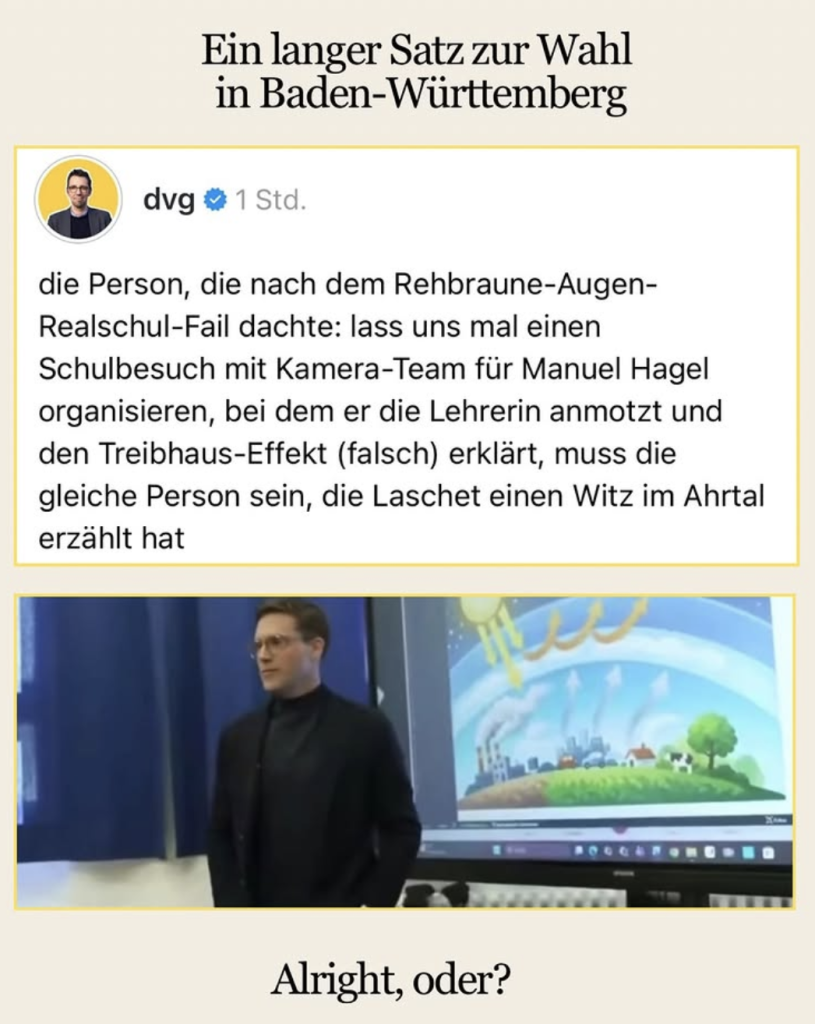 Durch den Bezug auf die Wahlniederlage von Armin Laschet bekam der Beitrag noch prognostische Wirkung. „Manuel Hagel ist nicht nur schlecht, sondern zu schlecht“ konnte die Maschine aus dem Beitrag herauslesen – und es Menschen mit der entsprechenden Haltung anzeigen.