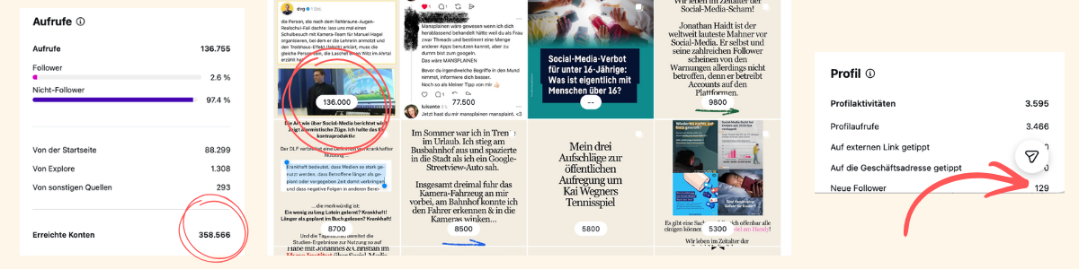 Den Eindruck habe ich jedenfalls seit ich vergangene Woche „viral“ gegangen bin. Ich hatte einen Beitrag über Manuel Hagel und seine missglückten Schul-Auftritte im Baden-Württemberg-Wahlkampf gepostet – und damit die Aufmerksamkeit des Algorithmus erregt. Jedenfalls wurde dieser Beitrag im folgenden sehr oft ausgespielt. Jedenfalls behauptet Instagram das. 336.000 Konten soll der Beitrag erreicht haben, behauptet die Plattform in ihren Insights genannten Statistiken, deren objektiven Wert ich nicht beurteilen kann. In Relation zu meinen sonstigen Beiträgen sticht der Hagel-Post aber schon heraus.