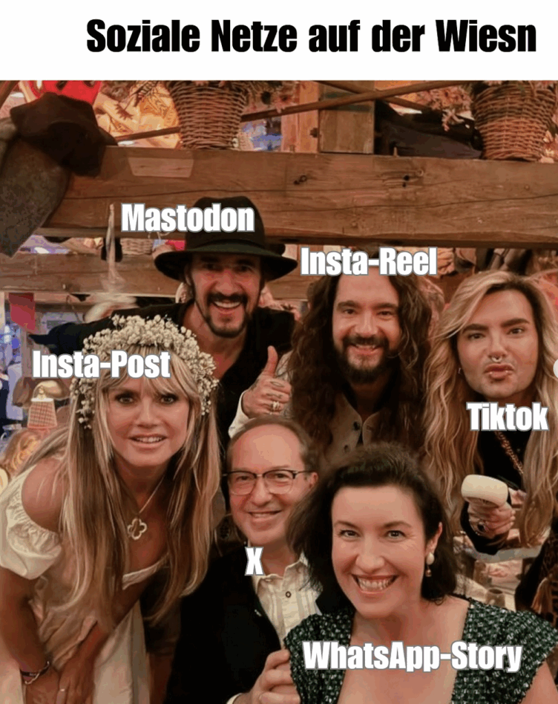 Das Instant-Meme des Monats stammt vom Oktoberfest. Bundesforschungsministerin Doro Bär hat die Vorlage gepostet: ein Foto, das sie mit ihrem Partei- und Kabinettskollegen Dobrindt im Rahmen von Heidis Oktoberfest mit Namensgeberin Heidi Klum, den Kaulitz Brüdern und Thomas Hayo zeigt.