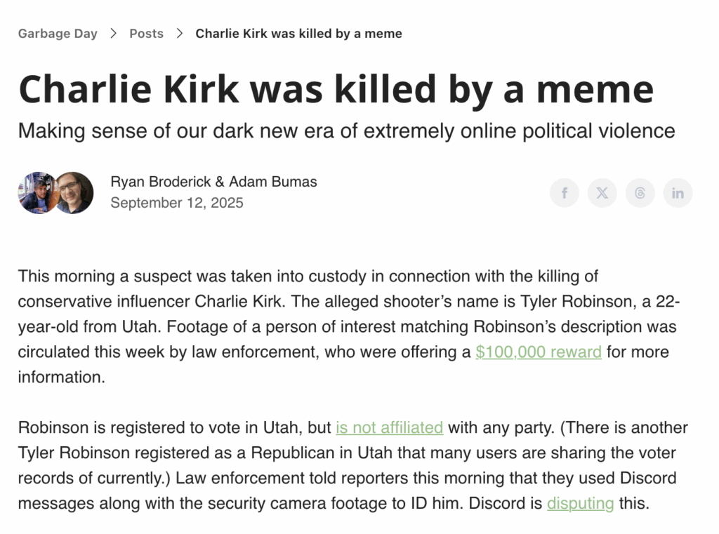 Der Mord an Charlie Kirk hatte nicht nur bedeutsame politische Folgen in diesem Monat. Der Versuch, die Botschaften zu entschlüsseln, die der mutmaßliche Attentäter auf den Patronenhülsen hinterließ, brachte auch die Frage der Netzkultur und ihrer Interpretation in die mediale Debatte. Killed by a Meme hieß der Text, auf den sich viele in der Folge bezogen – um zu erklären, wie die Kultur der Referenz und Bezugnahme in einem Ökosystem funktioniert, wo eine Aussage je nach Kontext viel ironischer gemeint sein kann, als sie im ersten Moment wirkt. Ich habe hier die fünf wichtigsten Fragen dazu zusammengefasst – und relevante Antworten verlinkt.