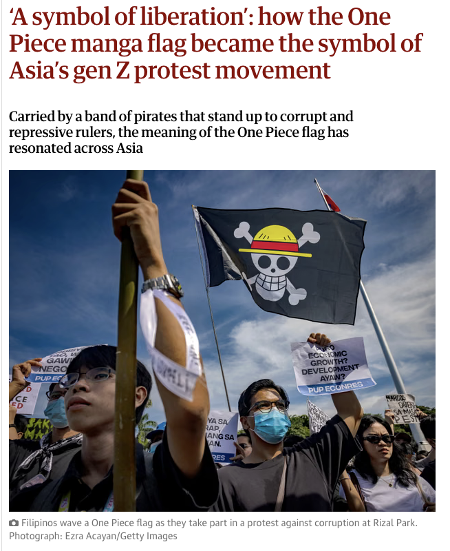Die Anime-Version der Piratenflagge ist zu einem politischen Symbol geworden. In Indonesien, Nepal und auf den Philippinen ist die Totenkopffahne aus dem japanischen Anime „One Piece“ zum Protestsymbol geworden. Der Guardian zitiert einen 23jährigen Studenten in Manila, der sagt: “Even though we have different languages and cultures, we speak the same language of oppression. We see the flag as a symbol of liberation against oppression … that we should always fight for the future we deserve.”