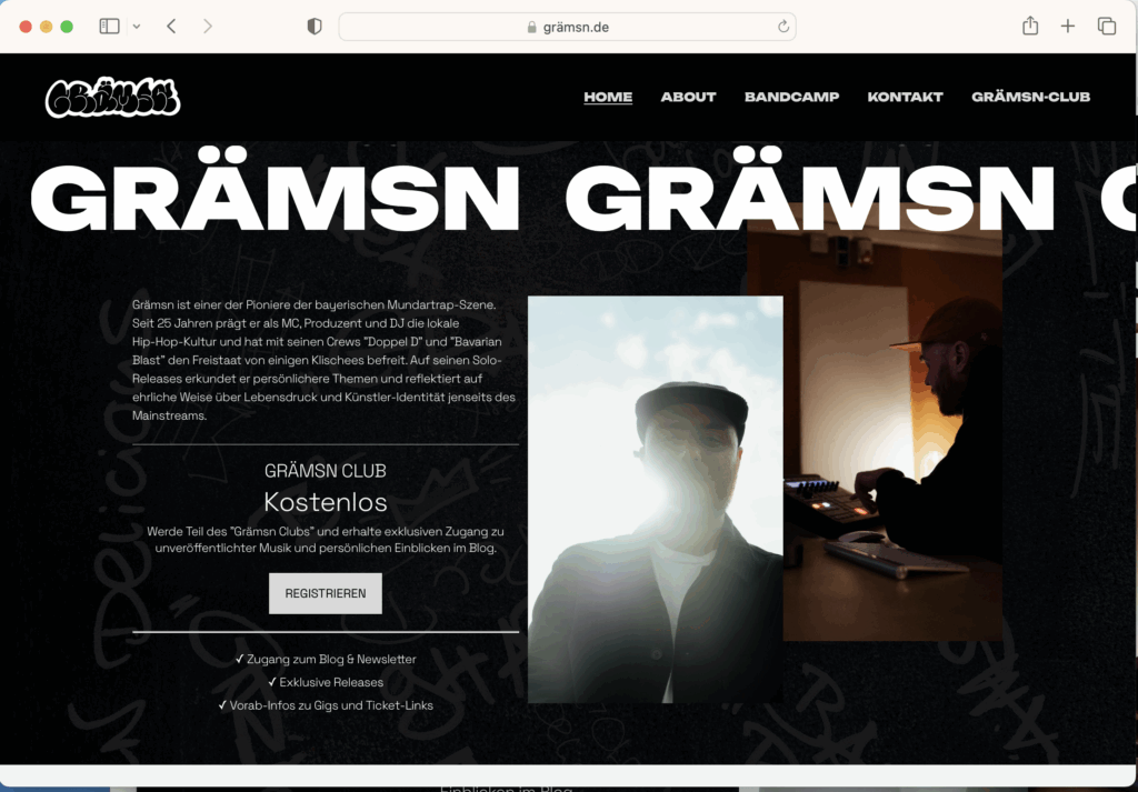 Es ist zumindest der Versuch, ja. Ich wollte tatsächlich etwas probieren, was über einen Newsletter hinausgeht, zumindest was das Gefühl für mich und evtl. auch für die Freunde und Fans angeht. Deswegen habe ich es nach paar Tagen Überlegen und Probieren den „Grämsn Club“ genannt. Auf meiner Website gibt es Basic-Infos über mich, einen Link zu Platten und Merch und die nächsten Live-Termine und das obligatorische Kontakt-Formular. Gleichzeitig gibt es aber eben noch den Club-Bereich, für den Du dich kostenlos anmelden kannst – aber eben auch aktiv entscheidest. In diesem Club tob ich mich gerade aus und probiere in einem Blog verschiedene Formate, außerdem gibt es auch exklusive Releases. Der Newsletter ist quasi die Verlängerung des Clubs, damit auch alle Mitglieder hin und wieder das Update bekommen, was es dort Neues gibt